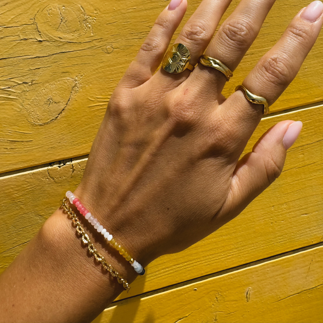 Af hensyn til armbåndets perler anbefaler vi dog at undgå mængden af vand, som armbåndet udsættes for.