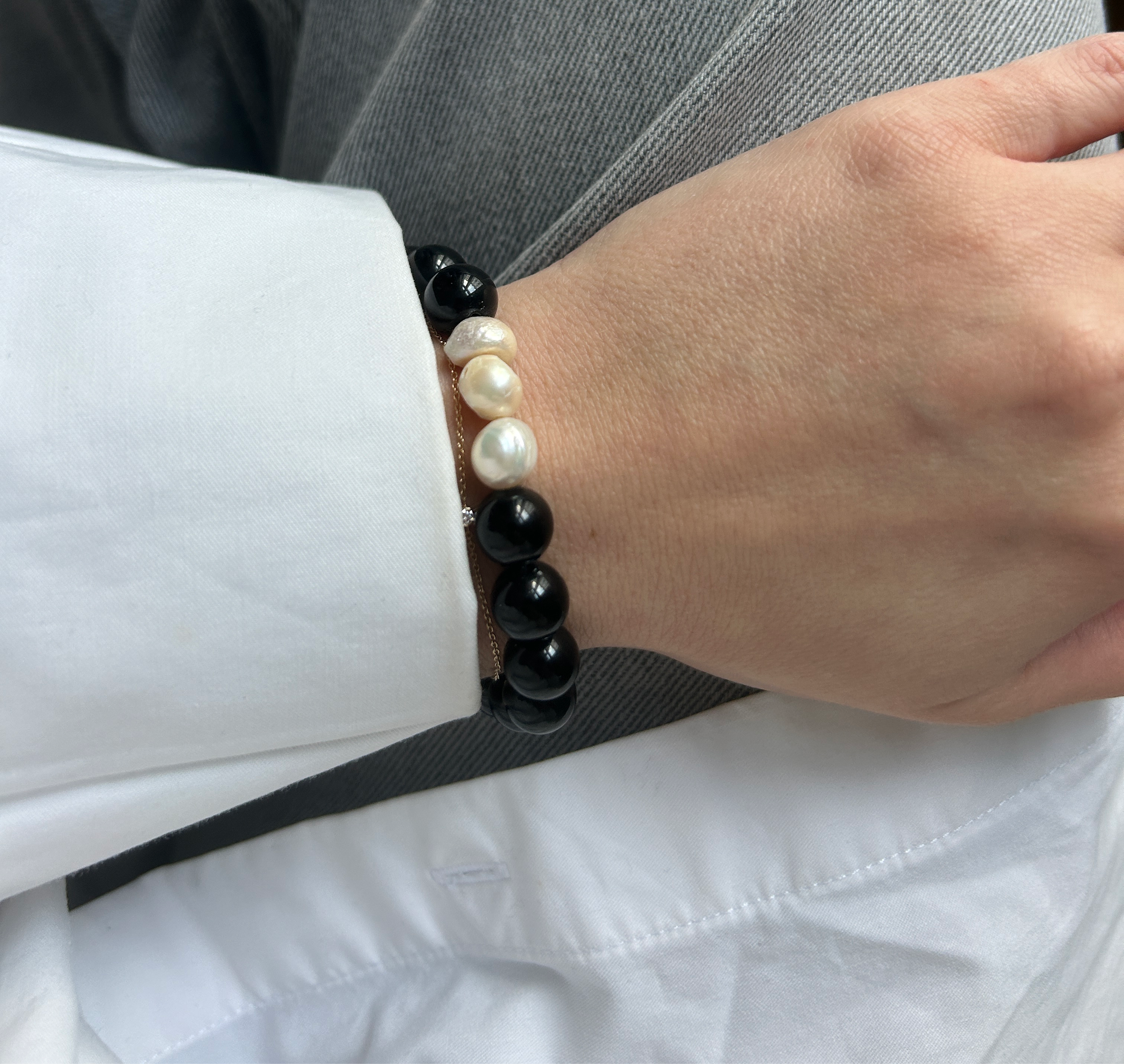 Rustfrit stål forgyldt med 18 karat guld. Armbåndets metal er nikkelfri og blyfri, jvf. dansk lovgivning og lavet af vandfast materiale, og kan tåle vand, sved og parfume.</p> Af hensyn til armbåndets perler anbefaler vi dog at undgå mængden af vand, som halskæden udsættes for.